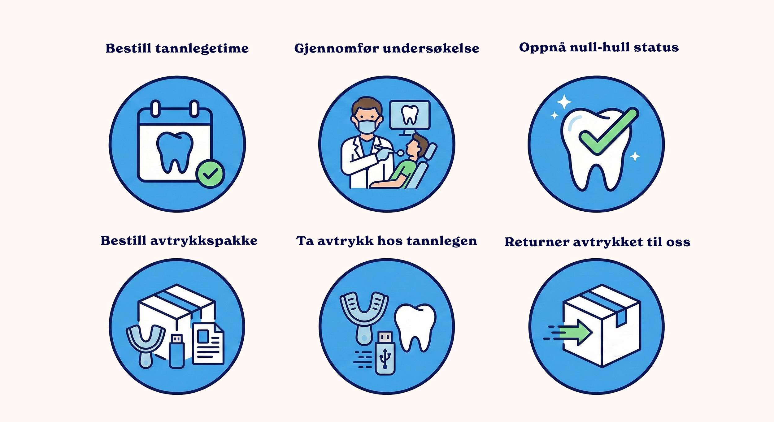 • Du bestiller en enkel time hos en av tannlegene vi samarbeider med, eller din lokale tannlege for å ta avtrykk av tennene. Avtrykket tas enten med støpeskjeen du mottar fra oss, eller digitalt og lagres på minnepennen som følger med i pakken. Kostnaden for selve avtrykket hos tannlegen ligger vanligvis på 800–1 500 kr, og dette er den eneste utgiften som kommer i tillegg til vår faste pris.