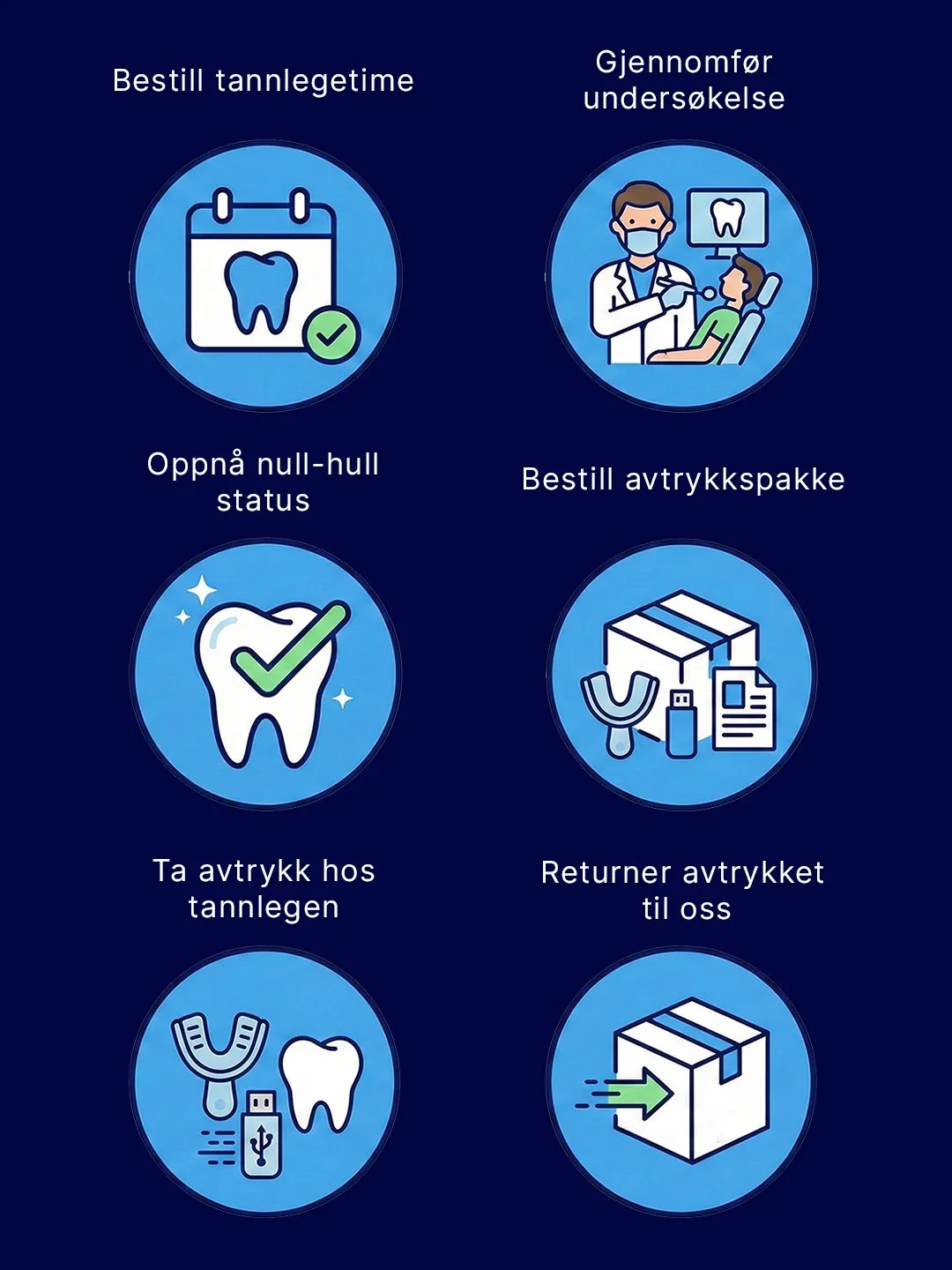 Du starter med å bestille en gratis avtrykkspakke via nettsiden. Når vi har mottatt og godkjent tannavtrykket ditt, sender vi deg en lenke for betaling av delprotesen. Produksjonen starter først etter dette.